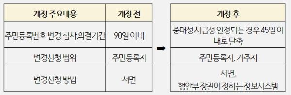 행정안전부는 주민등록번호 변경 청구의 중대성·시급성이 인정되는 경우에는 심사·의결 기간을 단축하는 등의 내용의 개정'주민등록법' 및 시행령이 2월 17일부터 시행된다고 밝혔다.