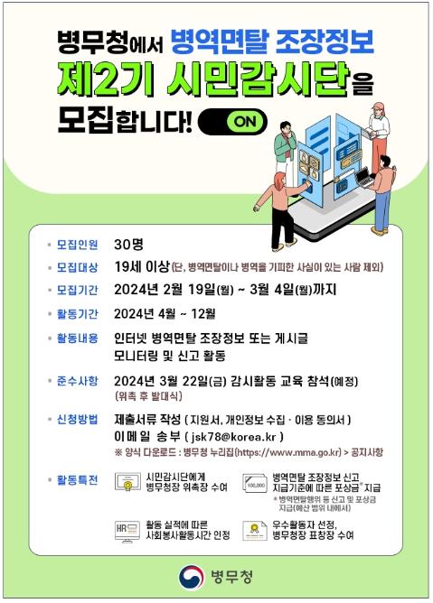 병무청은 온라인상의 병역면탈 조장정보를 차단하여 공정한 병역이행 문화를 조성하기 위해 ‘제2기 병역면탈 조장정보 시민감시단’을 공개 모집한다.