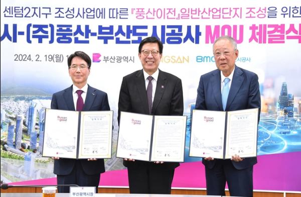 이번 양해각서 체결은 센텀2지구 도시첨단산업단지 조성사업 추진을 위한 마지막 과제인 ㈜풍산 부산사업장 이전에 관계기관이 상호 협력을 약속 하고자 마련됐다.