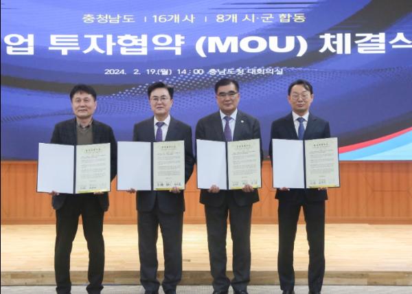 서천군이 19일 충남도청 대회의실에서 김태흠 충남도지사와 김기웅 서천군수를 비롯해 ▲윤종배 ㈜에이에스텍 대표 ▲허기복 ㈜폴린스 대표 등이 참석한 가운데 합동 투자협약(MOU)을 체결했다.
