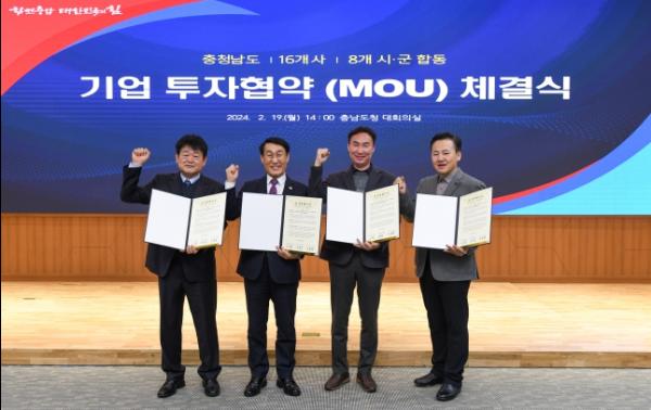이용록 홍성군수가 19일 충남도청 대회의실에서 열린 합동 투자협약(MOU) 체결식에서 김태흠 도지사와 3개 기업 대표와 함께 357억 규모의 투자협약을 체결하며 지역 내 고용시장 활성화의 신호탄을 쏘아 올렸다.