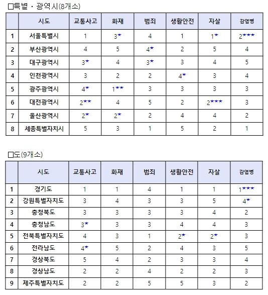 군?구 지역은 대구 달성·경북 칠곡(교통사고·화재·생활안전), 전북 진안(화재·범죄·자살), 서울 서초(교통사고·자살·감염병), 광주 남구(화재·범죄·생활안전), 울산 동구(교통·범죄·감염병)가 3개 분야에서 1등급을 달성했다.