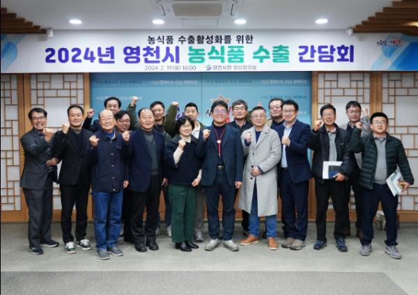 한국무역통계진흥원 농식품 수출정보에 따르면 2023년도 영천시 농식품 수출 실적은 8,396톤에 19,879천 불로 주요 수출국은 일본, 미국, 베트남, 대만, 홍콩 5개국으로 시장의 비중이 70%(수출금액 기준)를 차지했다. 주요 수출품목인 포도(203톤, 254만 불)는 대만 수출이 다소 증가, 마늘(88톤, 383천 불)은 지난해 미주시장에 첫 수출했으며. 가공 농식품 주요 수출 품목은 김치(500만 불), 인삼음료(155만 불), 소스류, 비알콜 음료 등이 상당 비중 차지하고 있다.