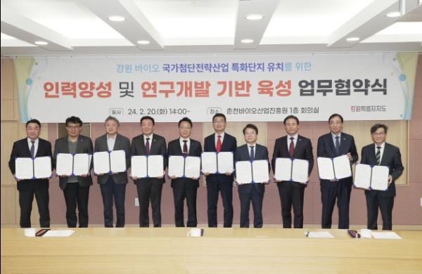 이날 협약식에는 강원도, 홍천군, 춘천시를 비롯해 강원대학교, 한림대학교, 연세대학교 미래캠퍼스, 한국폴리텍대학 춘천캠퍼스, 道경제진흥원, 강원테크노파크, 춘천바이오산업진흥원을 포함한 10개 대학 및 기관이 참여했다.