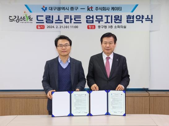 대구 중구는 21일 구청 소회의실에서 류규하 중구청장, 이차형 ㈜KT서대구지사장, 최성진 ㈜KT중대구지점장 등 관계자가 참석한 가운데 드림스타트 대상 아동의 정보통신 분야 후원을 위한 업무 협약을 체결했다.
