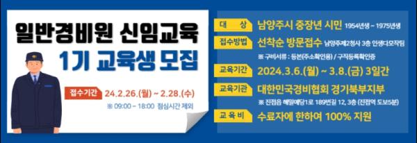 시는 먼저 일반경비원 신임교육으로 연간 120명을 대상으로 1~4기에 기수당 30명을 선발한다. 일반경비원 신임교육은 단기과정으로 1기는 3월 6일부터 8일까지 3일간 운영되며, 시설경비·호송·기계경비 실무 등 관련 법령까지 경찰청 지정 교육기관을 통해 교육받는다. 교육 후 공동주택, 빌딩 등 경비를 필요로 하는 모든 시설에 취업하게 된다.