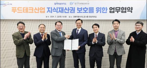 전북특별자치도와 한국지식재산보호원은 22일 전북자치도청에서 김종훈 경제부지사와 김용선 원장 등이 참석한 가운데 푸드테크 산업에 특화된 지식재산권 보호체계 확립을 위한 업무협약을 체결했다.