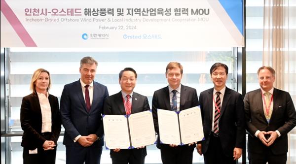 인천광역시는 유럽 출장 중인 유정복 인천시장이 현지 시각 2월 22일 오전 덴마크 코펜하겐에서 덴마크 국영기업이자 글로벌 해상풍력 1위 업체인 오스테드(Orsted) A/S와 『인천-오스테드 해상풍력 발전사업 및 인천지역 해상풍력산업 기반 구축을 위한 업무협약(MOU)』을 체결했다고 밝혔다.