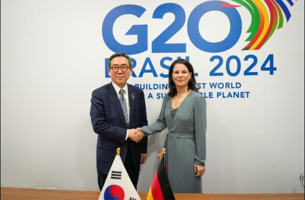 G20 외교장관회의(2.21.-22., 리우데자네이루)에 참석 중인 조태열 외교부 장관은 2월 21일 멜라니 졸리(M?lanie Joly) 캐나다 외교장관, 가미카와 요코(上川陽子) 일본 외무대신 및 에드몬도 치리엘리(Edmondo Cirielli) 이탈리아 외교차관과 양자 회담을 가진 데 이어, 2.22. ?스테판 세주르네(St?phane S?journ?)? 프랑스 외교장관, '아날레나 배어복(Annalena Baerbock)' 독일 외교장관, '주앙 크라비뉴(Jo?o Cravinho)' 포르투갈 외교장관과 약식회담을 갖고, △양국 관계, △국제무대 협력, △지역 정세 등에 대해 의견을 나누었다. 아울러 2월 21일 리우 시장 주최 만찬에 동석한 '데이비드 캐머런(David Cameron)' 영국 외교장관과도 북한 문제 및 주요 국제정세에 대해 폭넓은 의견교환을 가졌다.
