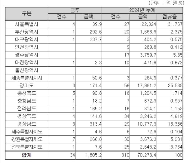 지역별로는 경상남도 313억 원, 부산광역시 293억 원, 강원특별자치도 269억 원, 그 밖의 지역이 930억 원이다.