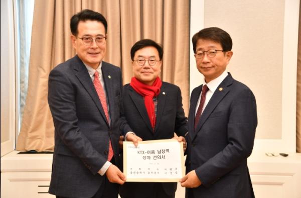 이순걸 울주군수가 서범수 국회의원과 함께 23일 국회를 방문해 박상우 국토교통부 장관에게 KTX-이음 남창역 정차를 위한 건의서를 전달했다.