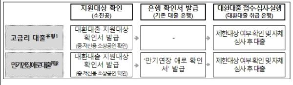 대환대출 지원대상은 두 가지 유형으로, 중?저신용(NCB 개인신용평점 839점 이하) 소상공인이 보유한 사업자 대출 중 ① 은행권·비은행권의 7% 이상 고금리 대출 또는 ② 은행권 대출 중 자체 만기연장이 어려워 은행에서 ‘만기연장 애로 확인서’를 발급해준 대출이다.