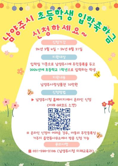 남양주시는 26일 학부모의 교육비 부담 경감과 지역 경제 활성화를 위해 2024년 초등학교 신입생을 대상으로 1인당 10만 원의 입학축하금을 지급한다고 밝혔다.