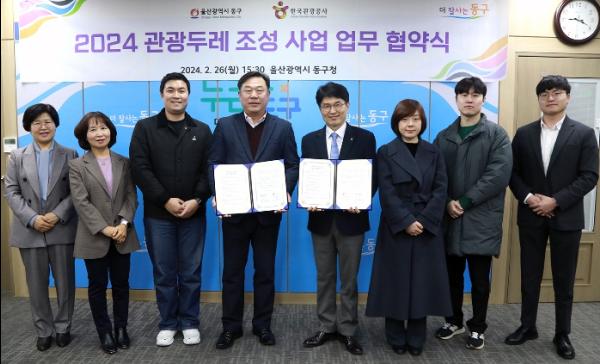 울산 동구는 2월 26일 오후 3시 30분 구청장실에서 한국관광공사와 함께 '2024 관광두레 조성 사업’에 대한 업무협약을 체결했다. 협약식에는 박형관 한국관광공사 부산울산경남지사장, 김종훈 동구청장, 강지훈 울산 동구 관광두레PD, 그리고 관계자들이 참석했다.