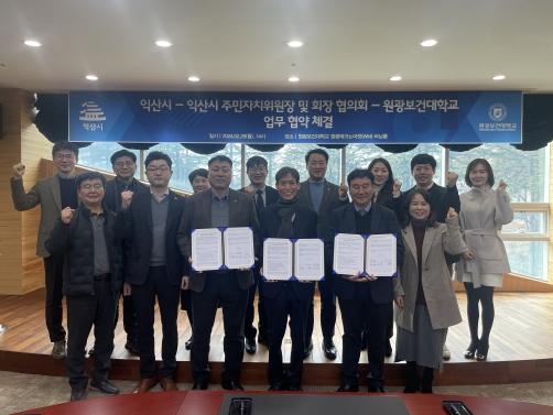 협약식에는 허전 익산시 부시장과 백준흠 원광보건대 총장, 김양배 주민자치위원장 협의회장, 주민자치위원장 협의회 임원 등 10여 명이 참석해 하이브(HiVE) 사업의 성공적인 추진을 위한 결속을 다졌다.