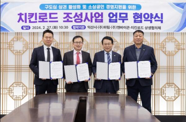 시는 27일 익산시청에서 '치킨로드 조성사업' 추진을 위한 업무협약(MOU)을 체결했다. 이날 협약에는 정헌율 익산시장과 정호석 ㈜하림 대표이사, 한원탁 ㈜엔바이콘 대표이사, 김양배 치킨로드 상생협의체 대표가 참석했다.
