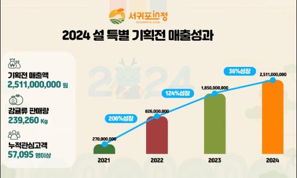 서귀포시 공식 온라인 쇼핑몰'서귀포in정'이 2024년 설 기획전‘갑진(甲辰) 이벤트’를 추진한 결과 25억 1천1백만 원의 매출을 기록하며, 역대 단일 기획전 최고 매출액을 초과 달성했다.