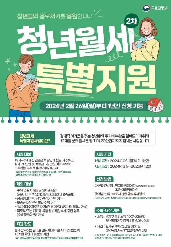 지원대상은 부모에게서 독립해 거주하는 19~34세 무주택 청년이며, 보증금 5천만 원 이하, 월세 70만 원 이하인 주택에 거주하는 저소득 청년(청약통장가입자)이 해당된다.