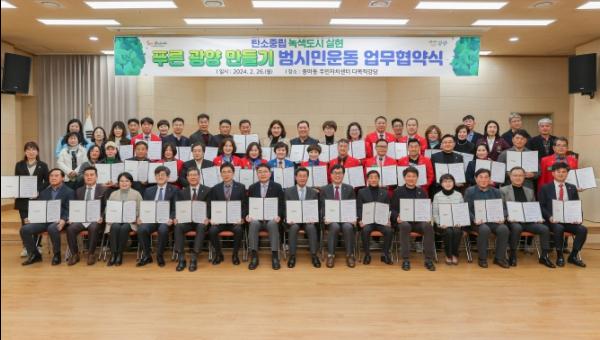 광양시는 26일 전남광양교육지원청, 광양상공회의소, 광양시산림조합, 환경단체, 사회단체, 봉사단체 등 66개 기관?단체가 참여한 가운데 ‘푸른 광양 만들기’ 범시민운동 업무협약을 체결했다.