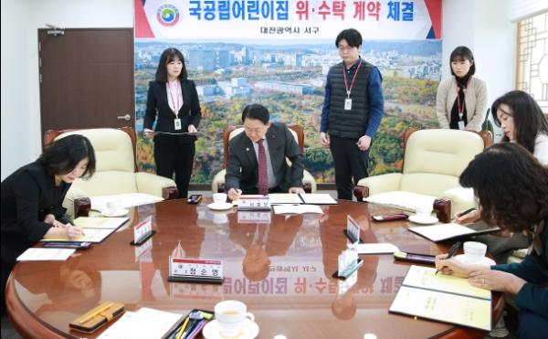 대전 서구는 지난 26일 구청 갑천누리실에서 도안예미지어린이집, 구슬어린이집, 아이자람어린이집과 국공립어린이집 위·수탁 계약을 체결했다.