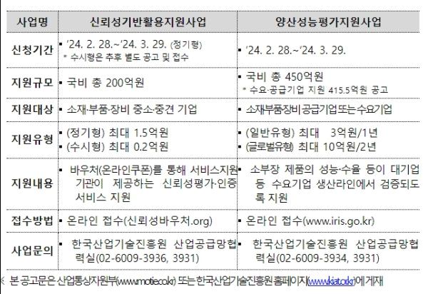소부장 기업의 신뢰성 평가 및 양산 성능평가 지원을 위한 ’24년도 사업이 본격적으로 추진된다. 산업통상자원부는 ’24년도 소부장‘신뢰성기반활용지원사업’과‘양산성능평가사업’을 산업통상자원부 및 한국산업기술진흥원(KIAT) 홈페이지에 공고하고 신청기업 지원을 받는다고 밝혔다.
