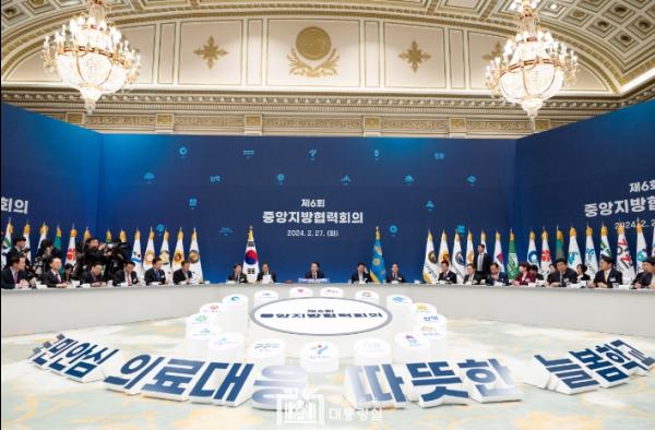 윤석열 대통령은 2월 27일 오후 영빈관에서 제6차 중앙지방협력회의를 주재했다. 오늘 회의는 중앙지방협력회의 개최 후 전국 17개 시도지사와 시·도 교육감이 한자리에 모인 첫 사례로, ‘의료 개혁’과 ‘2024년 늘봄학교 준비’ 2가지 안건을 논의했다.