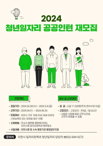 이천시는 2월 28일부터 3월 8일까지 ?청년일자리 공공인턴사업?추진으로 상반기 참여자 10명을 재모집한다.