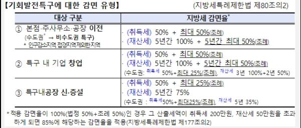 지방세 감면을 위해서는 △수도권 외 기회발전특구에서 본점이나 공장을 이전하여 사업을 시작하기 전에 부동산을 취득하고, △이전하기 전 6개월 이상 수도권에서 사업(조업)을 한 기업이어야 하며, △기회발전특구에서 사업 시작 후 6개월 내 기존의 본점·공장을 폐쇄해야하는 등의 기준을 모두 충족해야 한다.