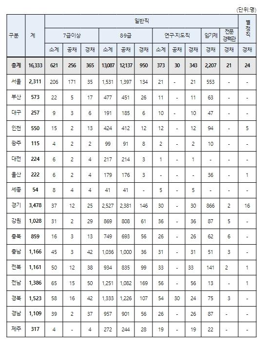 직종별로는 일반직공무원 16,309명과 별정직공무원 24명을 선발하며, 이 중 일반직은 7급 이상 621명, 8·9급 13,087명, 연구·지도직 373명, 임기제 2,207명, 전문 경력관 21명이다.