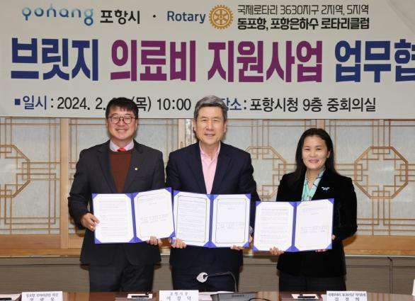 포항시는 29일 국제로타리 3630지구 2지역(동포항), 5지역(포항은하수) 로타리클럽과 취약계층 틀니 및 브릿지 시술 비용을 지원하는 ‘의료비지원사업 업무협약식’을 개최했다.