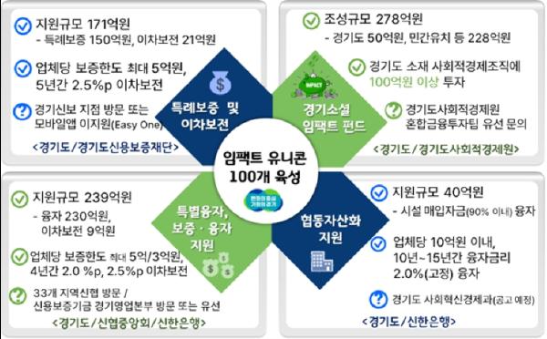 경기도가 2026년까지 연간 매출 100억 원 이상 또는 기업가치 500억 원 이상인 사회적경제기업을 말하는 ‘임팩트 유니콘’ 100개를 육성하겠다고 밝힌 가운데 올해 육성 사업의 하나로 총 550억 원 규모의 금융지원 사업 4개를 추진한다.