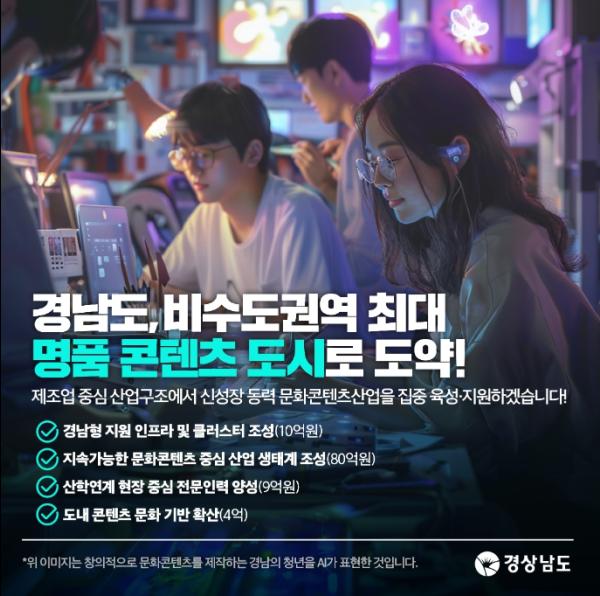 경상남도는 올해 103억 원을 투입하여 경남의 제조업 중심 산업 구조에서 신성장 동력인 문화콘텐츠산업을 집중 육성하기 위한 다양한 사업을 속도감있게 추진한다