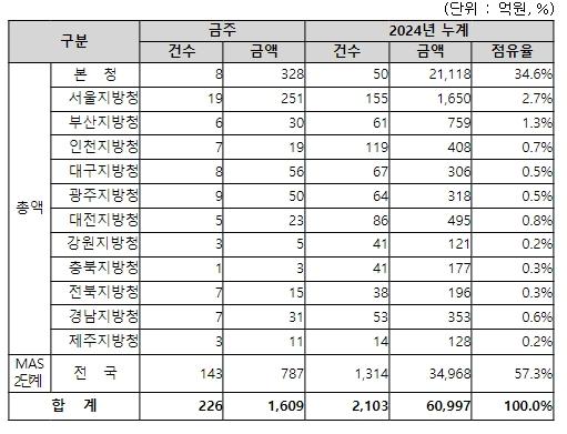 지역별 발주량을 보면, 총액계약 대상 822억 원 중 본청이 328억 원으로 39.9%를 집행하고 서울청 등 11개 지방청에서 494억 원을 각각 집행할 예정이다.
