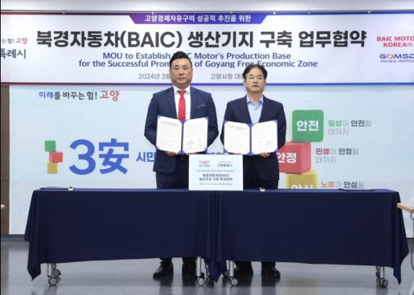 고양특례시가 6일 중국 국영 자동차 기업인 북경자동차와 지정신청을 앞둔 고양경제자유구역 내 4조원 대규모 전기차 생산시설 구축을 위한 업무협약을 체결했다고 밝혔다.