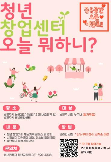 남양주시민 누구나 예약을 통해 공유공간을 무료로 이용할 수 있으며, 오픈 기념 이벤트는 온라인을 통해 선착순으로 무료 참여가 가능하다.