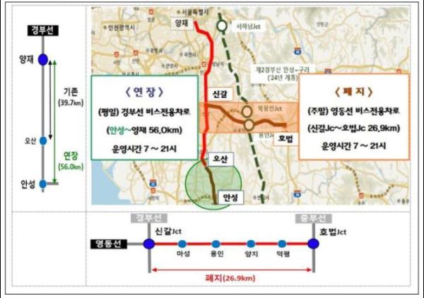 국토교통부와 경찰청은 평일 경부선 고속도로 버스전용차로 구간을 안성나들목(총 56.0km)까지 연장하고, 주말 영동선 고속도로 버스전용차로 구간을 폐지한다.