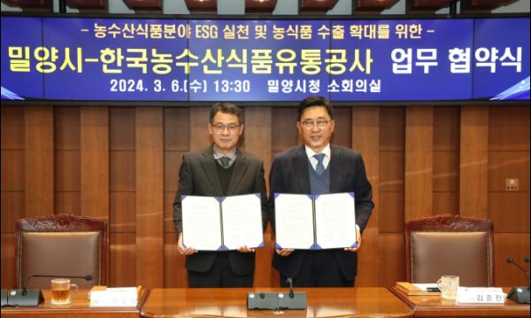 밀양시는 6일 시청 소회의실에서 한국농수산식품유통공사(aT)와 저탄소 식생활 실천 확산과 농식품 수출 확대를 위한 업무 협약을 체결했다고 밝혔다.