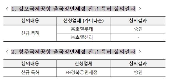 이번 특허심사위원회에서는 ①김포국제공항 출국장 면세점 신규 특허, ②청주국제공항 출국장 면세점 신규 특허 사업자 선정을 의결했다.