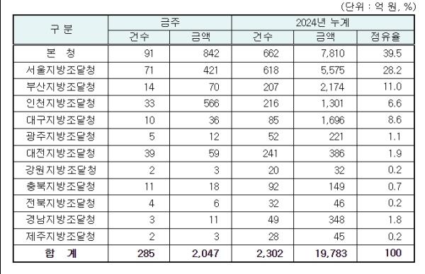 지역별 발주량을 보면 대전광역시 소재 본청 842억 원, 서울지방청 421억 원 등 2개청(1,263억 원)이 전체 금액(2,047억 원)의 61.7%를 차지하고 있으며, 인천 등 나머지 10개 지방청 784억 원이 각각 집행될 예정이다.