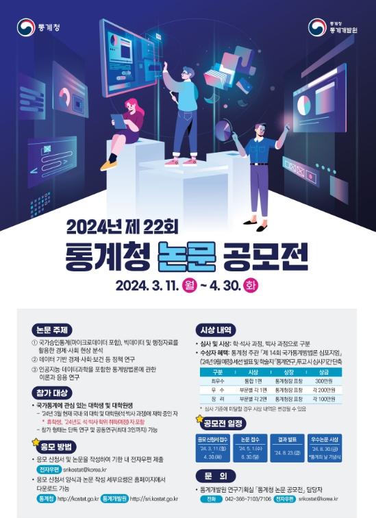 이형일 통계청장은 “제22회 통계청 논문 공모전이 창의적인 아이디어가 가득한 대학(원)생들에게 국가통계와 데이터에 대한 이해를 제고하고 데이터 가치와 활용능력을 배가하는 계기가 되길 기대한다”며, 대학(원)생들의 적극적인 공모전 참여를 당부했다.