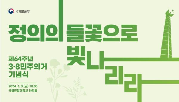 국가보훈부는 1960년 대전지역 학생들이 중심이 되어 일어난 충청권 최초의 민주화 운동인 3·8민주의거를 기억하고 그 정신을 계승하기 위한 ‘제64주년 3·8민주의거 기념식’을 8일 오전 10시 국립한밭대학교(아트홀, 대전광역시 유성구)에서 거행한다고 밝혔다.