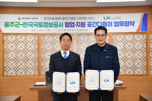 울산시 울주군이 7일 군청 은행나무홀에서 한국국토정보공사(LX) 부산울산지역본부와 ‘2024년도 공간다듬이 서비스’ 업무협약을 체결했다.
