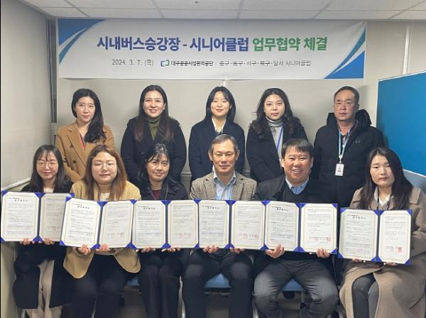 대구공공시설관리공단과 대구시 5개 구 시니어클럽이 3월 7일 어르신 일자리 창출 및 버스승강장 정화활동을 위한 ‘2024년 버스승강장 도우미 사업 업무협약’을 체결했다.