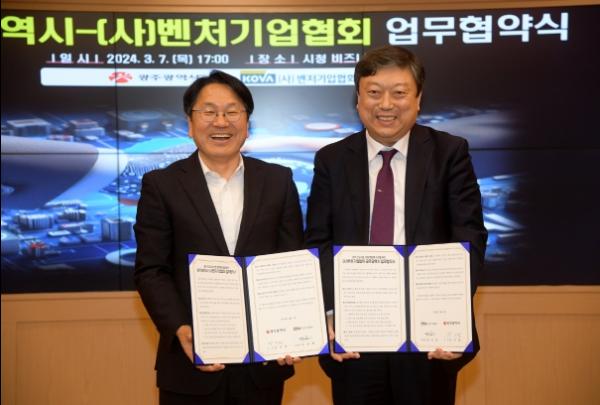 광주광역시는 7일 오후 시청 비즈니스룸에서 벤처기업협회와 ‘광주 인공지능(AI) 산업 생태계 조성을 위한 업무협약’을 체결하고 잠재력 이 높은 인공지능기업 발굴과 기업 성장 지원에 적극 협력키로 했다.