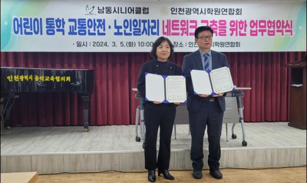 업무협약식은 남동시니어클럽 홍정민 관장과 인천광역시학원연합회 이선기 회장이 참석한 가운데 노인의 보람된 삶을 지원하고 어린이의 안전한 교통문화를 정착하기 위한 상호 협력을 위해 이뤄졌다.