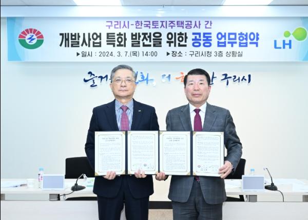 구리시는 지난 7일 시청 3층 상황실에서 한국토지주택공사(LH)와 ‘구리시 관내에서 LH가 추진하는 대형 개발사업의 특화 발전을 위한 공동업무협약’을 체결했다고 밝혔다.
