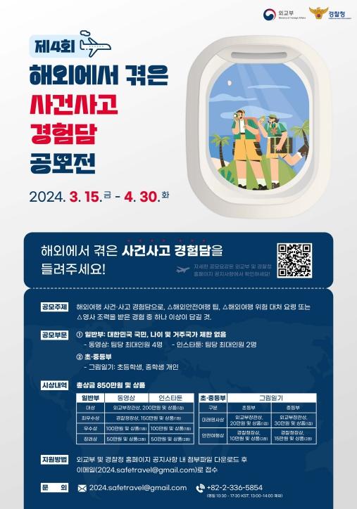 외교부와 경찰청은 공동으로 국민의 안전한 해외여행을 위한 정부 지원제도 및 영사조력법을 홍보하고, 해외 사건사고 예방 및 위기 상황 대처법 소개를 위해, 정부의 ‘제4회 해외에서 겪은 사건사고 경험담 공모’를 3월15일부터 4월30일까지, 46일 동안 진행한다.