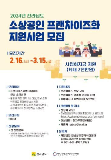 전라남도는 2024년 소상공인 프랜차이즈화 지원사업에 참여할 기업을 오는 15일까지 모집한다고 밝혔다.