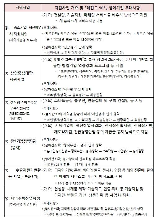 이 외에도 창업중심대학, 지능형(스마트)공장, 지역주력산업육성 등에서 서류평가가 생략되어 『레전드 50 』 참여기업들이 한결 가벼운 마음으로 지원사업을 신청할 수 있게 됐다.