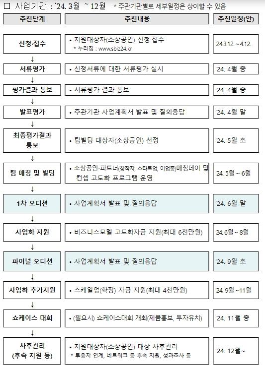 이번 공고를 통해 선발된 60개팀은 팀단합(팀빌딩) 프로그램을 거쳐 1차 심사(오디션)를 치르게 되며, 1차 심사(오디션)를 통해 선발되는 30개조(팀)는 사업모형(모델) 고도화 자금을 최대 6천만원까지 지원받을 수 있다.